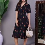 Women’s Elegant Indigo & Orange Floral Block Print Cotton Shirt Dress